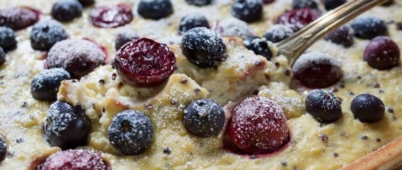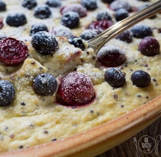 – Apkepo formos kraštus patepkite sviestu arba aliejumi. Supilkite varškės masę, ant viršaus užberkite uogas arba vaisius.